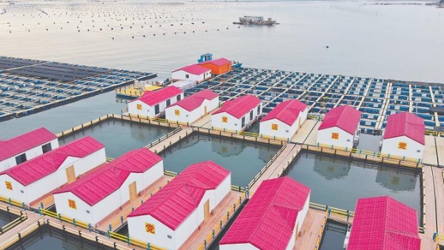 盛夏时节,位于霞浦县溪南镇七星海域的海上养殖示范区,铺陈着的新型塑胶渔排和网箱整齐划一,与大红色屋顶的管理房组成美丽的“海上田园”风光。据悉,七星示范区面积1万亩,涉及24376口渔排,截至目前,已下水深水大网箱252口,清退并改造传统渔排18000余口,是宁德海域最大的以深水网箱为主体的海上新型渔排展示区域。(福建日报记者 吴鹏 摄)