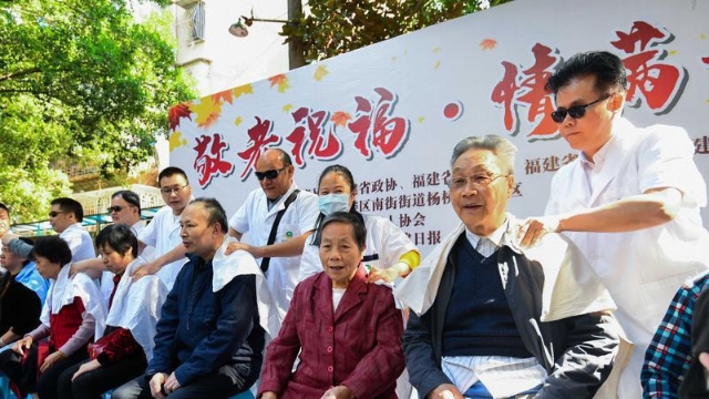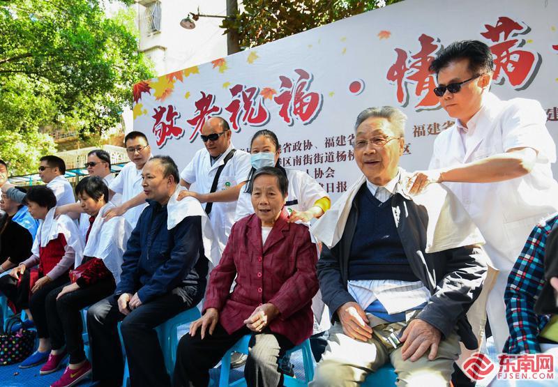 24日,省政协、省民政厅、省总工会、省残联与鼓楼区杨桥河南社区联合开展重阳节敬老活动。活动中,福建省盲人协会主席王永澄(右一)带着盲人按摩师为社区老人义诊。福建日报记者 游庆辉 摄