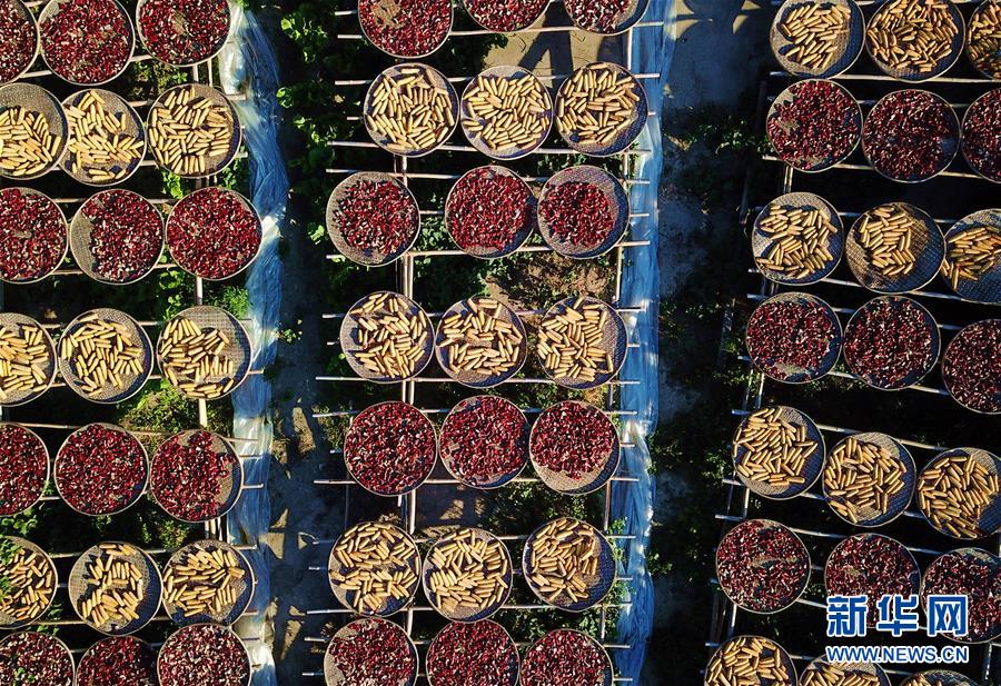 11月1日,桂峰村村民在整理晒匾里的农作物。 深秋时节,位于福建省三明市尤溪县洋中镇的桂峰村,古民居与晒匾里五彩缤纷的农作物,构成五彩斑斓的调色板,展现秋收风情。 新华社记者魏培全摄