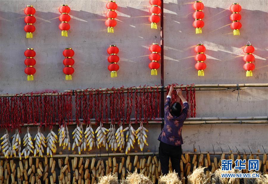 11月1日,一名村民在整理晒架上的农作物。 深秋时节,位于福建省三明市尤溪县洋中镇的桂峰村,古民居与晒匾里五彩缤纷的农作物,构成五彩斑斓的调色板,展现秋收风情。 新华社记者魏培全摄