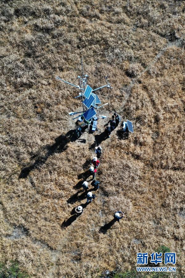 12月1日,在武夷山国家公园黄岗山顶,科考人员走过中山草甸前往碳通量塔考察并收集监测数据(无人机照片)。