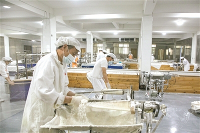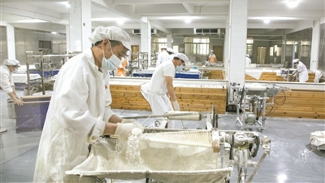 12月9日,在福安市“好穆阳线面”观光体验工场内,工人们正进行线面生产、包装。