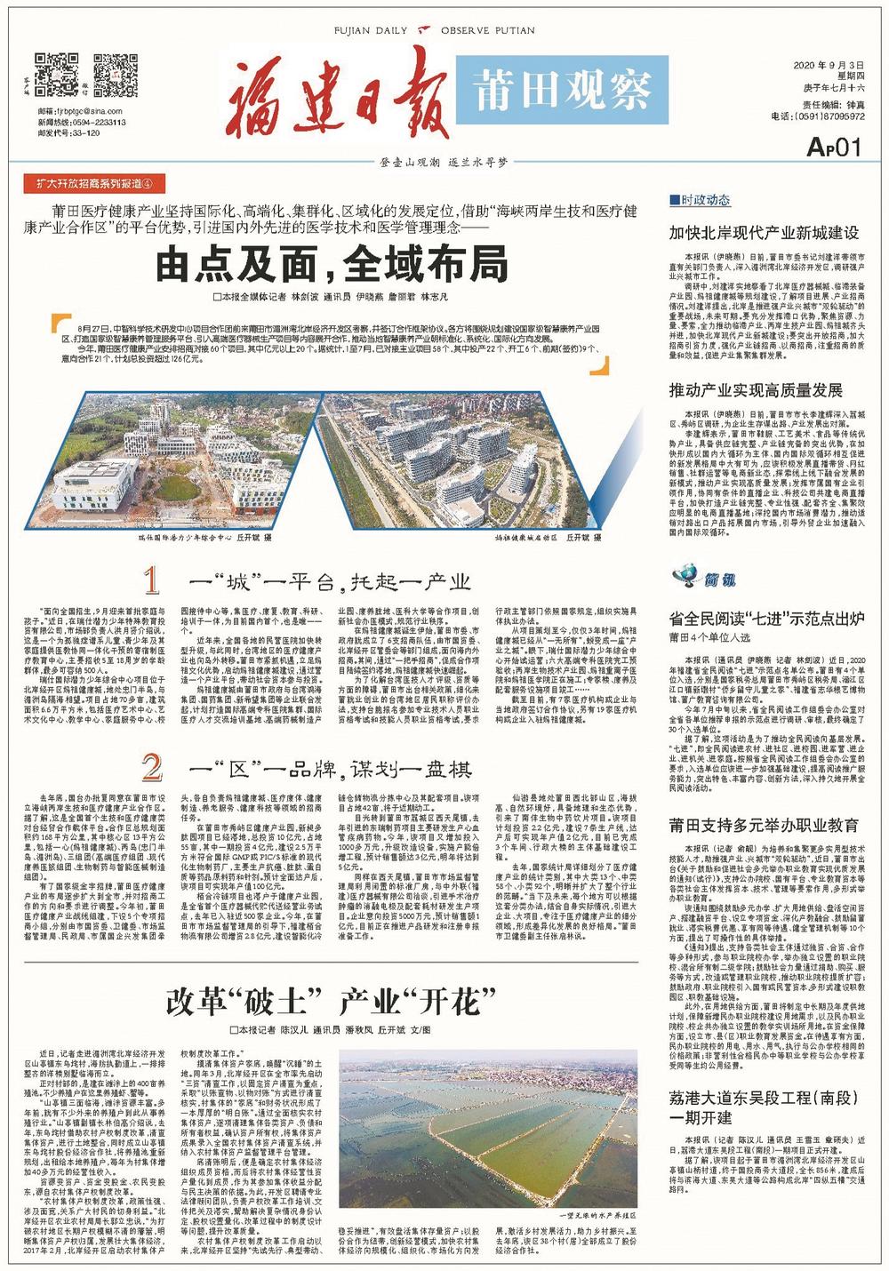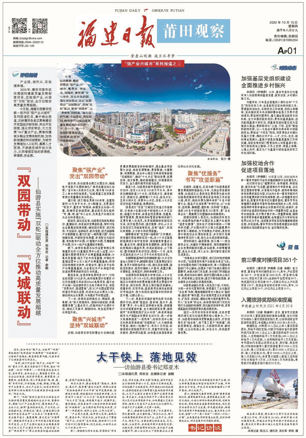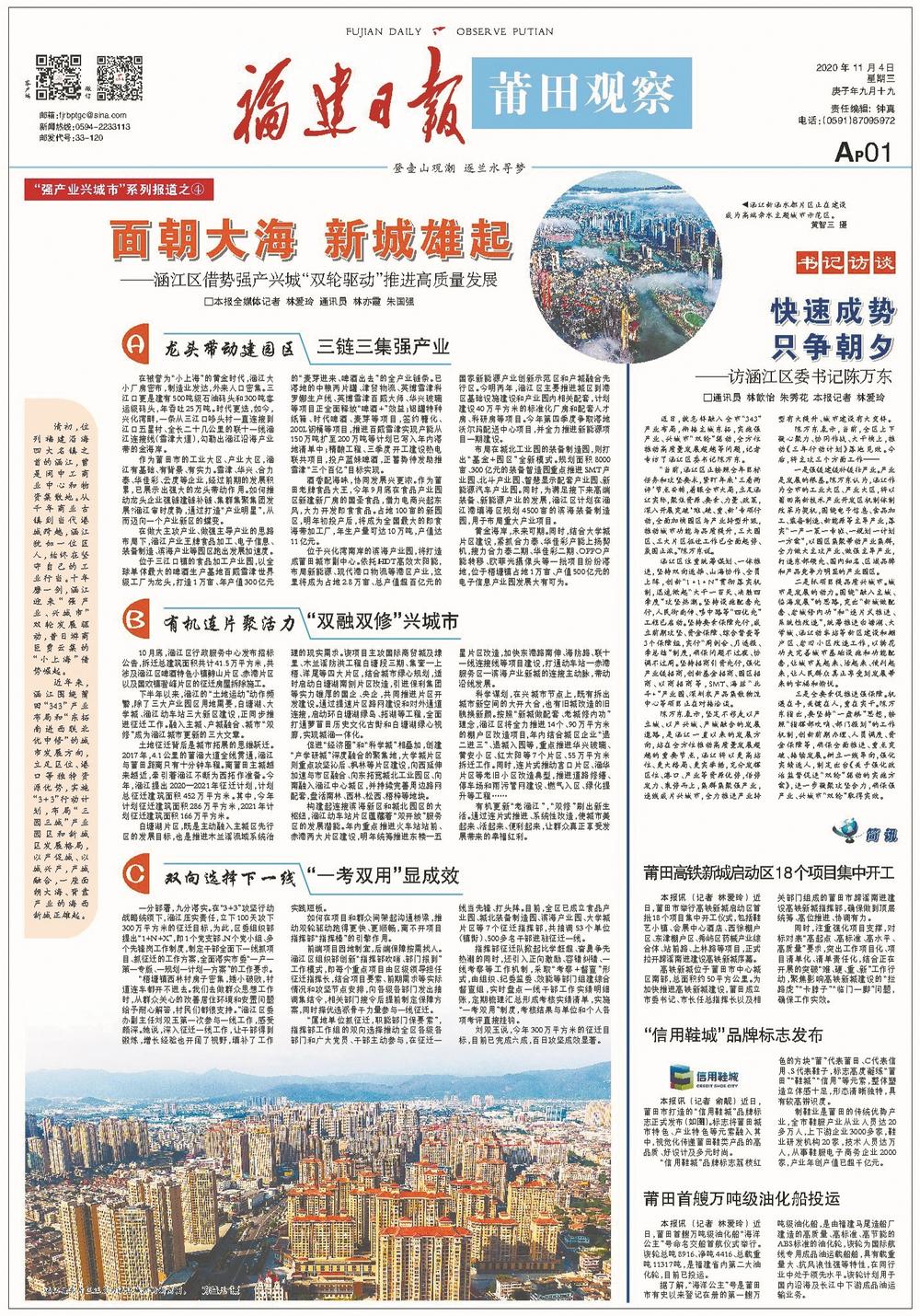 今年,莆田市委市政府围绕构建高质量发展制度体系,实施双轮驱动,全方位推动高质量发展超越。 10月15日起,《莆田观察》开设“强产业 兴城市”系列报道栏目,集中推出报道,反映莆田各县区及有关部门聚焦建设开放型经济新体制,大力发展“343”重点产业;聚焦构建城乡融合发展体制机制,加快新城建设和旧城更新,为城市发展增加人口红利、集聚人才资源。 东南网12月30日讯(福建日报全媒体记者 林剑波 通讯员 詹丽君 杨剑铖 伊晓燕)2020年是全面建成小康社会之年,也是“十三五”规划收官之年。今年,莆田深入学习贯彻习近平总书记重要讲话、重要指示批示精神,落实省委、省政府重大决策部署,突出开放招商,强化项目带动,实施“强产业、兴城市”双轮驱动,全方位推动高质量发展超越。 促发展:突出开放招商 23日,莆田市举行国家级新型功能材料产业集群重大项目签约活动,永荣新材料200万吨丙烷制丙烯项目总投资396亿元、莆田石门澳作业区泊位项目总投资120亿元、福建永荣科技有限公司增资扩股项目总投资79.2亿元……不少重量级的大项目、好项目实现签约。 年初疫情暴发,莆田市紧抓疫情防控和经济社会发展,为企业防控疫情和复工复产排忧解难,持续打通复工复产操作链。同时,快速调整招商策略和方式,充分利用互联网平台,开展不见面招商,推动企业增资扩产。 为凝聚合力,同步推进招商工作和对外合作,莆田市委、市政府整合资源,成立开放招商工作领导小组,由市委书记和市长任双组长、各单位主要负责人参与;组建专项招商队伍,对项目进行跟踪服务。 “秉持莆田以外就是开放的理念,以更加开放的姿态拥抱世界、拥抱未来。”莆田市委书记刘建洋表示,坚持做到“开放带动与创新驱动”“招大引强与招新引高”“招商引资与招才引智”“优选增量与做大存量”“统筹协调与分级负责”5个相结合,抢抱“金娃娃”产业项目。 根据重点招商产业,莆田市设立5条战线招商组,包括工业和信息化、现代服务业、现代农业、文化旅游产业和医疗健康产业,建立“一条战线、一位指挥长、一套人马、一份作战方案、一抓到底”的“五个一”工作机制,制定全市统一招商画册,强化信息共享,确保分工协作。 此外,莆田还完善“市开放招商领导小组—五条战线招商组—县区(管委会)”三级协调决策机制,将全市招商工作糅合成一盘棋,协调解决项目在各个环节中遇到的困难和问题。 1月至11月,莆田全市新增对接项目415个,其中产业类322个,计划投资2868.28亿元;总部和平台类项目93个,完成签约及公司注册65个。