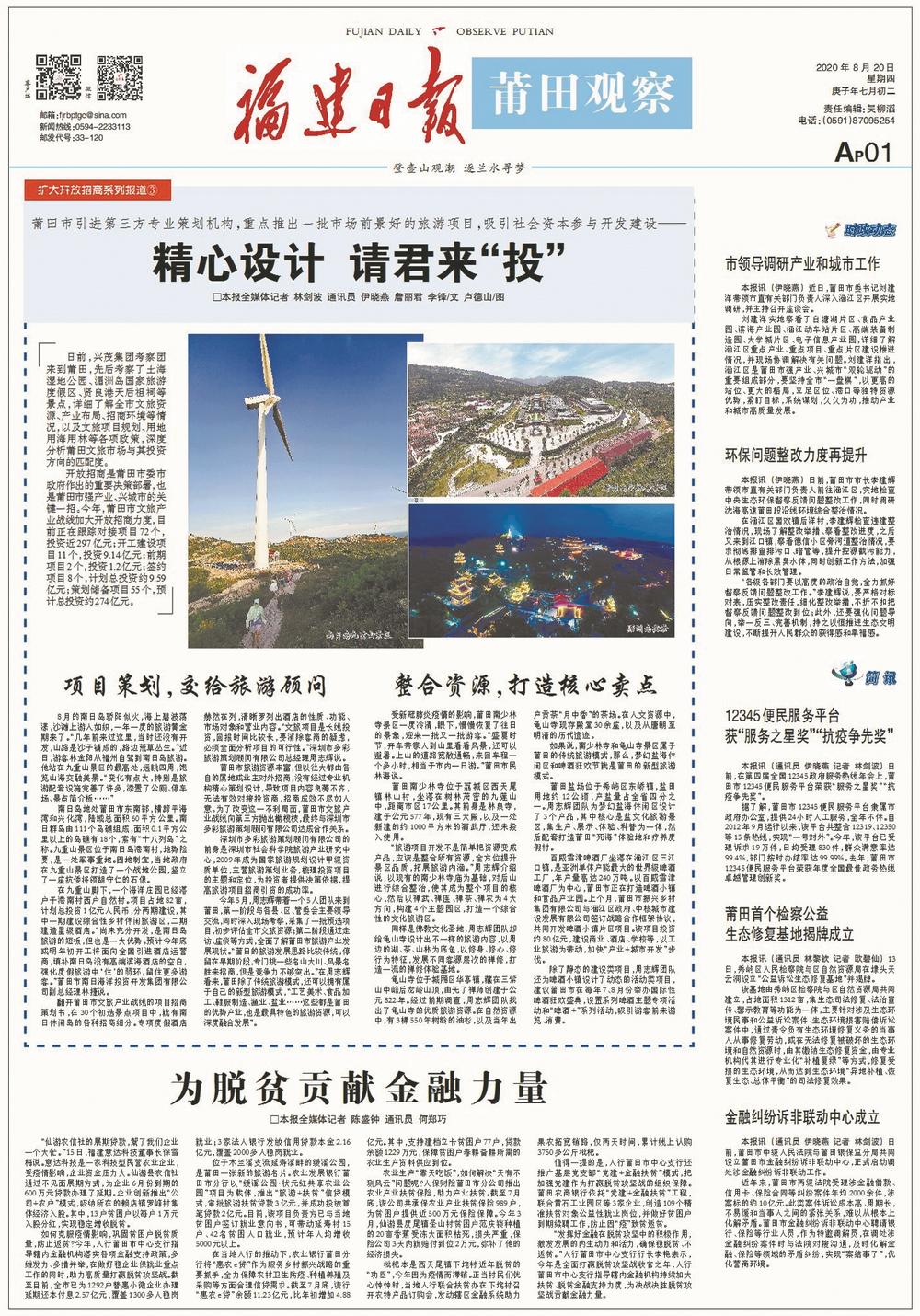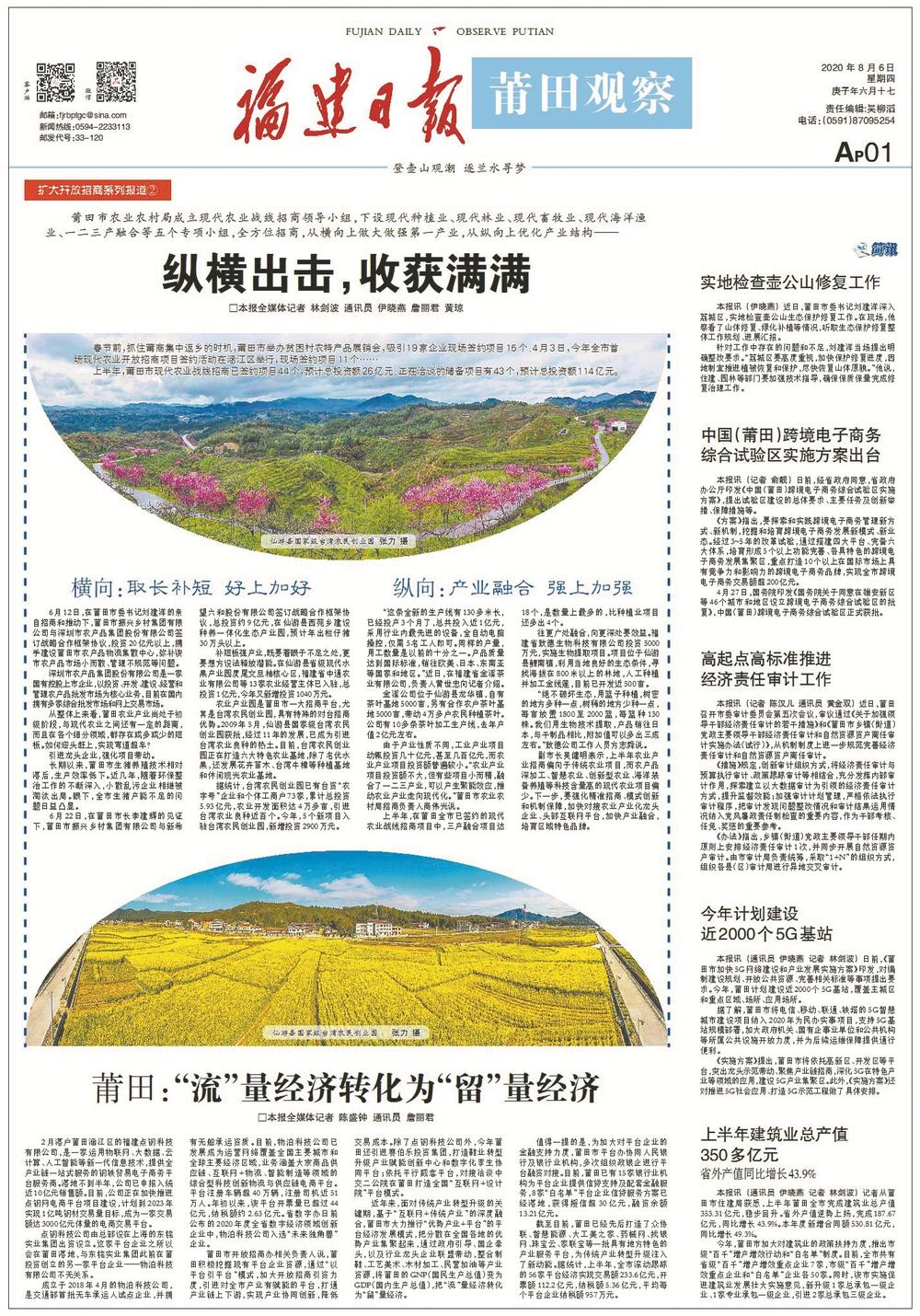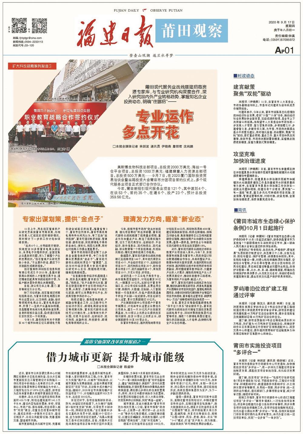 今年,莆田市委市政府围绕构建高质量发展制度体系,实施双轮驱动,全方位推动高质量发展超越。 10月15日起,《莆田观察》开设“强产业 兴城市”系列报道栏目,集中推出报道,反映莆田各县区及有关部门聚焦建设开放型经济新体制,大力发展“343”重点产业;聚焦构建城乡融合发展体制机制,加快新城建设和旧城更新,为城市发展增加人口红利、集聚人才资源。 东南网12月30日讯(福建日报全媒体记者 林剑波 通讯员 詹丽君 杨剑铖 伊晓燕)2020年是全面建成小康社会之年,也是“十三五”规划收官之年。今年,莆田深入学习贯彻习近平总书记重要讲话、重要指示批示精神,落实省委、省政府重大决策部署,突出开放招商,强化项目带动,实施“强产业、兴城市”双轮驱动,全方位推动高质量发展超越。 促发展:突出开放招商 23日,莆田市举行国家级新型功能材料产业集群重大项目签约活动,永荣新材料200万吨丙烷制丙烯项目总投资396亿元、莆田石门澳作业区泊位项目总投资120亿元、福建永荣科技有限公司增资扩股项目总投资79.2亿元……不少重量级的大项目、好项目实现签约。 年初疫情暴发,莆田市紧抓疫情防控和经济社会发展,为企业防控疫情和复工复产排忧解难,持续打通复工复产操作链。同时,快速调整招商策略和方式,充分利用互联网平台,开展不见面招商,推动企业增资扩产。 为凝聚合力,同步推进招商工作和对外合作,莆田市委、市政府整合资源,成立开放招商工作领导小组,由市委书记和市长任双组长、各单位主要负责人参与;组建专项招商队伍,对项目进行跟踪服务。 “秉持莆田以外就是开放的理念,以更加开放的姿态拥抱世界、拥抱未来。”莆田市委书记刘建洋表示,坚持做到“开放带动与创新驱动”“招大引强与招新引高”“招商引资与招才引智”“优选增量与做大存量”“统筹协调与分级负责”5个相结合,抢抱“金娃娃”产业项目。 根据重点招商产业,莆田市设立5条战线招商组,包括工业和信息化、现代服务业、现代农业、文化旅游产业和医疗健康产业,建立“一条战线、一位指挥长、一套人马、一份作战方案、一抓到底”的“五个一”工作机制,制定全市统一招商画册,强化信息共享,确保分工协作。 此外,莆田还完善“市开放招商领导小组—五条战线招商组—县区(管委会)”三级协调决策机制,将全市招商工作糅合成一盘棋,协调解决项目在各个环节中遇到的困难和问题。 1月至11月,莆田全市新增对接项目415个,其中产业类322个,计划投资2868.28亿元;总部和平台类项目93个,完成签约及公司注册65个。
