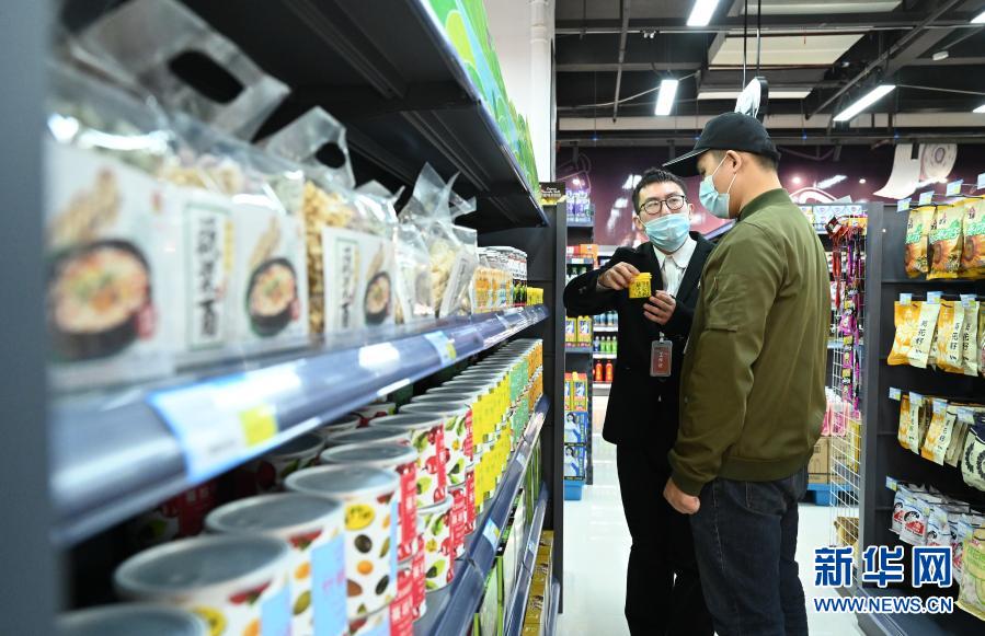 12月30日,来自台湾的程启涛(左)在南平台湾青年实训基地同心生活超市给大陆的同事介绍台湾产品。新华社记者 林善传 摄