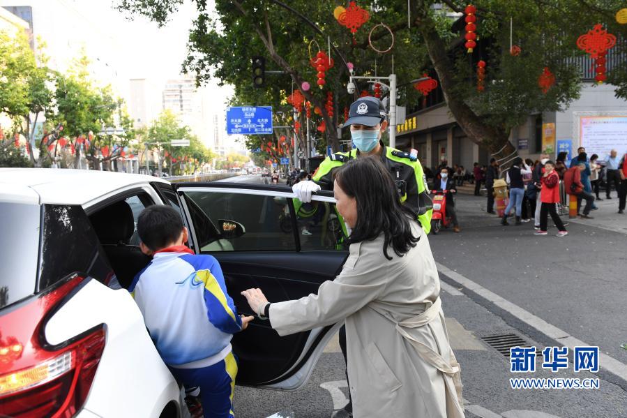 2月22日,在福州市鼓楼第一中心小学门口,附近交警标准示范岗的民警引导学生迅速上车。新华社记者 宋为伟 摄