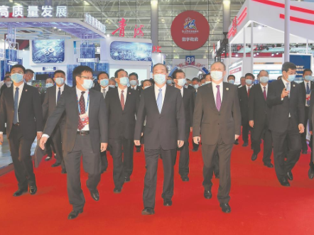 二十五日,中共中央政治局委员、中宣部部长黄坤明,在省委书记尹力、省长王宁等陪同下,参观第四届数字中国建设峰会展馆。本报记者 肖春道 摄