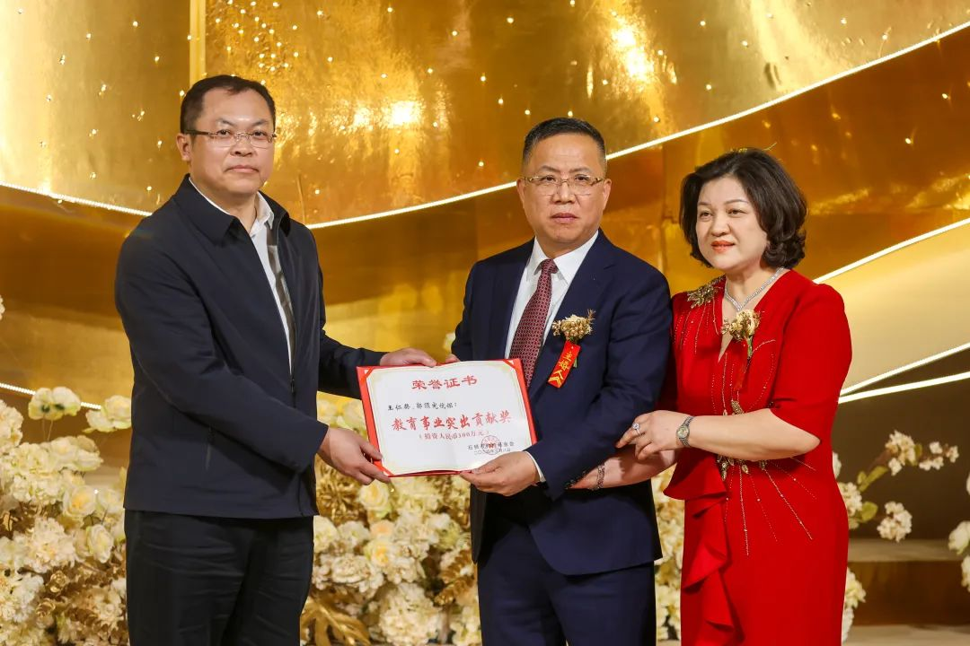 捐赠仪式上,石狮市委书记蔡永生向王仁奖、郭须完伉俪颁发了“教育事业突出贡献奖”荣誉证书。石狮市领导余志伟、李斌、黄延艺、陈守林、刘艺波、李怀忠、林志坚、谢建智、施汉杰,石狮市教育基金会理事长陈贻萍,香港石狮同乡总会会长林佑碧,以及石狮市有关部门、灵秀镇相关负责人等参加仪式。 石狮市委常委、统战部部长刘艺波在致辞中表示,石狮人豪迈大气、商行天下、善行天下,有着“乐善好施”的胸怀气度和“心系桑梓”的赤子情怀,近年来更是涌现出了一大批热心公益的乡贤。福建省政协委员、世界石狮同乡联谊会常务副会长、香港石狮同乡总会候任会长王仁奖先生,正是其中的典型代表。多年来,王仁奖先生艰苦创业、勤劳致富,在事业有成的同时,多次捐资助力家乡教育等各项公益事业发展,得到社会各界的赞誉。正是有许许多多像王仁奖先生这样乐善好施、无私奉献的杰出乡贤,积极投身石狮教育事业,营造了全社会尊师重教、崇智尚学的良好风尚;同时,也让我们深深感受到广大像王仁奖先生这样的港澳同胞、海外侨胞浓烈的家国情怀。希望通过此次捐赠仪式,能带动更多侨亲乡贤、社会贤达加入到公益捐赠行列中,凝聚推动教育等公益事业强劲力量,携手书写石狮这座大爱城市的崭新篇章! 石狮是全国著名侨乡,全市现有海外华侨华人超25万人,主要分布在世界49个国家和地区,其中近90%居住在东南亚各国;有港澳同胞超9万人。石狮籍华侨华人、港澳同胞素以热心公益、支持家乡公益事业而著称,据不完全统计,2020年以来,石狮全市共接受华侨华人捐赠金额1.625亿元,主要集中在基础设施、文化教育、医疗卫生等公益事业领域,促进了石狮市各项公益事业发展,为石狮发展做出了重大贡献。作为香港石狮同乡总会候任会长,王仁奖对家乡的教育等公益事业始终饱含深情,多年来多次爱心捐资,彰显了一位企业家崇德向善、乐善好施的美好品格。值其爱子王明焕和爱媳林嘉茵喜结良缘之际,他与家人再次响应石狮移风易俗的号召,慷慨捐赠500万元,以实际行动诠释责任和爱心,助力擦亮“文明石狮”“大爱石狮”名片。  |