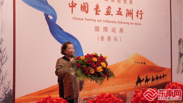 香港中华文化推广交流协会会长陈金儿致辞 主办方供图 香港中华文化推广交流协会会长陈金儿介绍,作为“中国书画五洲行”国际巡展的特别策划,《百岁使者——刘锦琳艺术展》 精彩纷呈,让人目不暇接。刘锦琳曾长驻过捷克、坦桑尼亚使馆,担任过外交部司局级领导。她酷爱中国传统书画文化,离休近40年来,创作了无数寓意深远的花鸟画。这些花鸟画在中国文化中有着典型的象征意义,它们不仅是美丽的自然元素,更承载着中华民族的精神内涵和文化底蕴。从这个意义上说,刘锦琳不愧是中华文化推广交流大使。