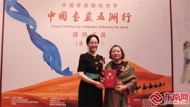 颁发聘书 主办方供图 此外,为进一步推动“中国书画五洲行”国际巡展走进更多“一带一路”沿线国家,刘文迪代表五洲和平书画院向陈金儿颁发了“中国书画五洲行”国际巡展“全球推广大使”聘书。