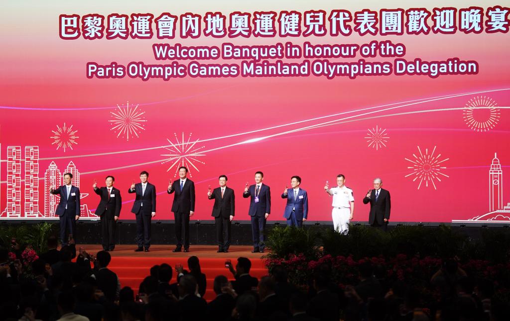 新华社香港8月29日电(记者 王茜 黄扬)香港特区政府29日晚在会议展览中心举行晚宴欢迎内地奥运健儿代表团访港。香港特区行政长官李家超感谢国家体育总局接受特区政府邀请,带领内地奥运健儿代表团访问香港。他致辞表示,巴黎奥运会闭幕不到三星期,代表团就来到香港,香港各界对代表团访港非常期待。 李家超、国务院港澳事务办公室四局副局长陈伟、香港中联办秘书长王松苗、外交部驻港公署特派员崔建春、解放军驻香港部队政治委员赖如鑫、中国香港体育协会暨奥林匹克委员会会长霍震霆等嘉宾,以及国家体育总局局长、内地奥运健儿代表团团长高志丹和代表团成员出席欢迎晚宴。
